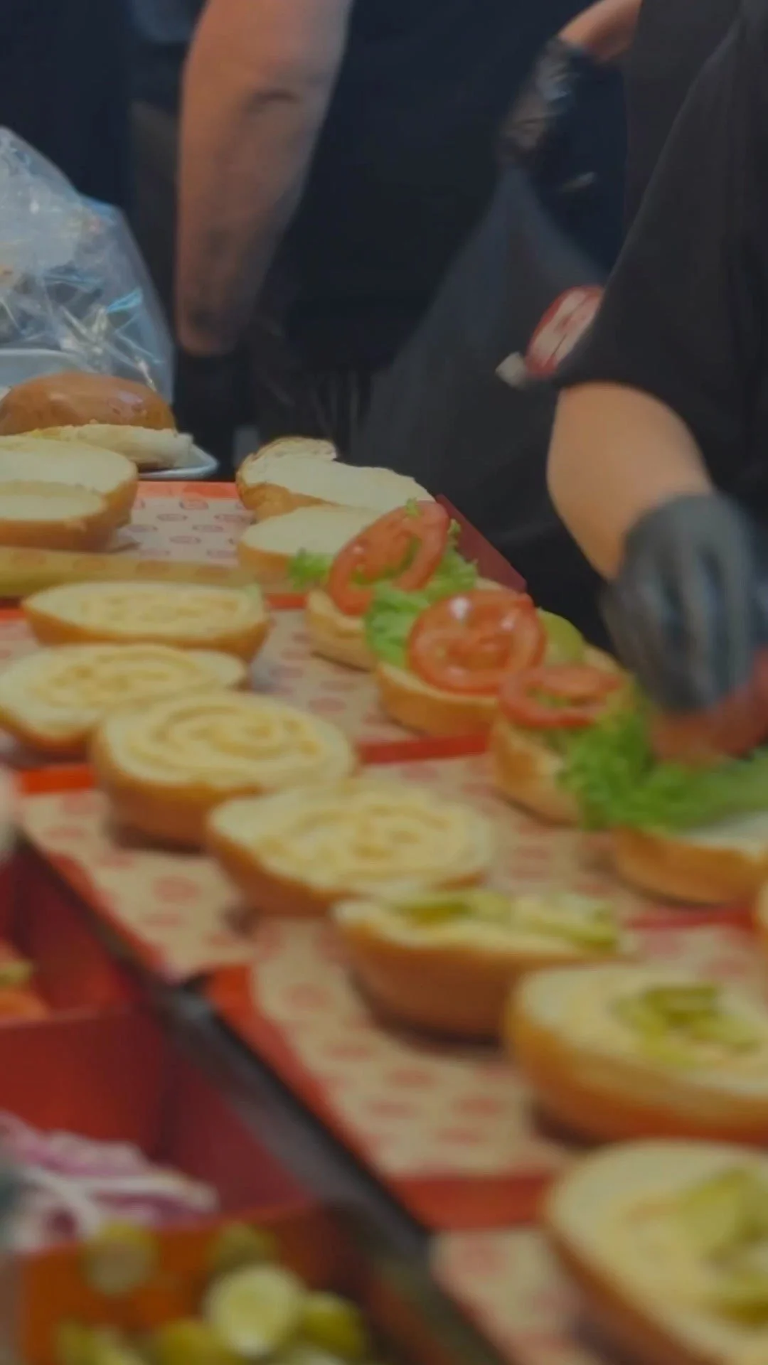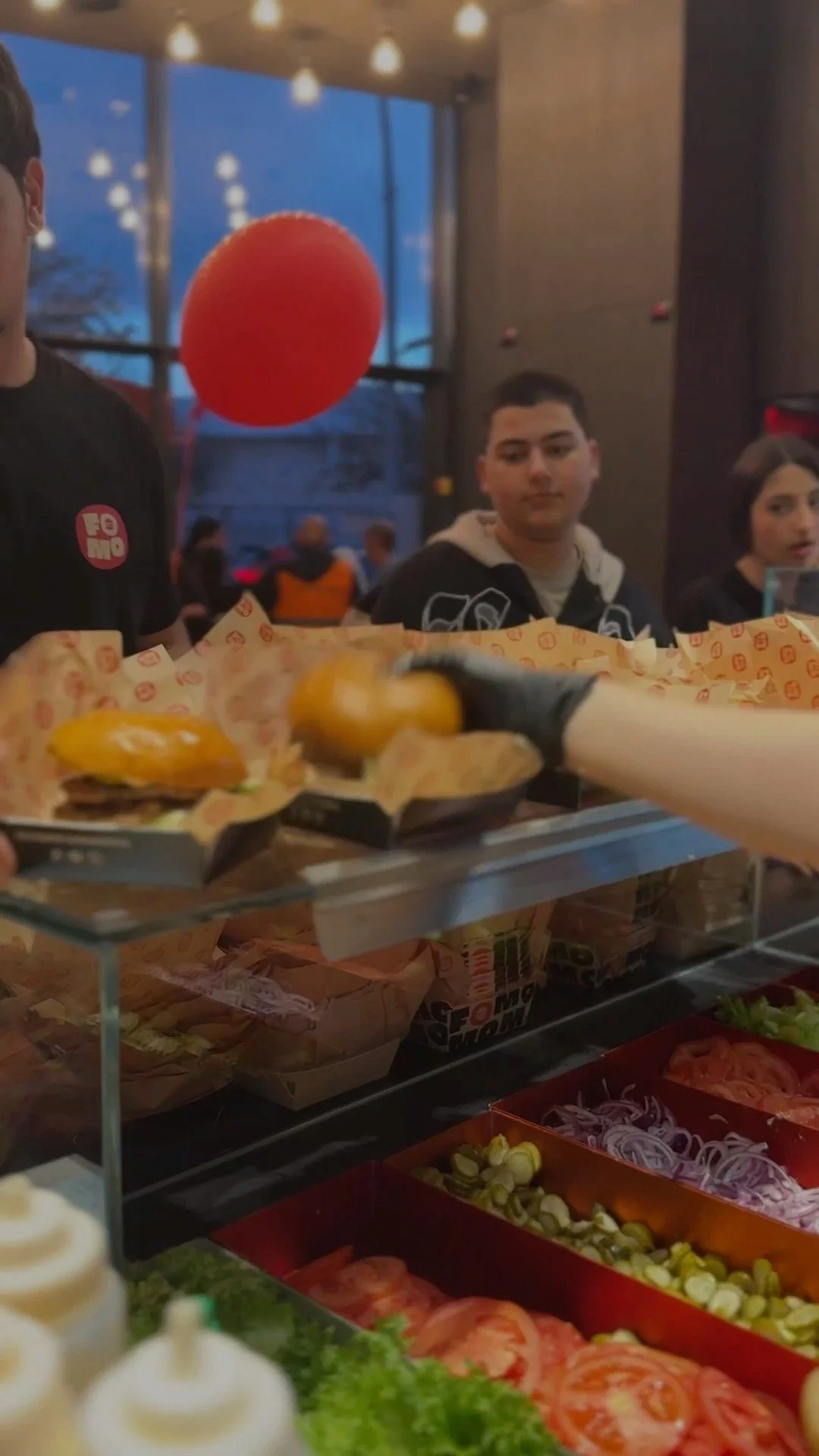 100% בקר פריומיום טרי שנטחן במקום, עגבנייה, חסה, מלפפון חמוץ, בצל סגול וקטשופ FOMO על הלחמנייה בלחמנייה שלנו